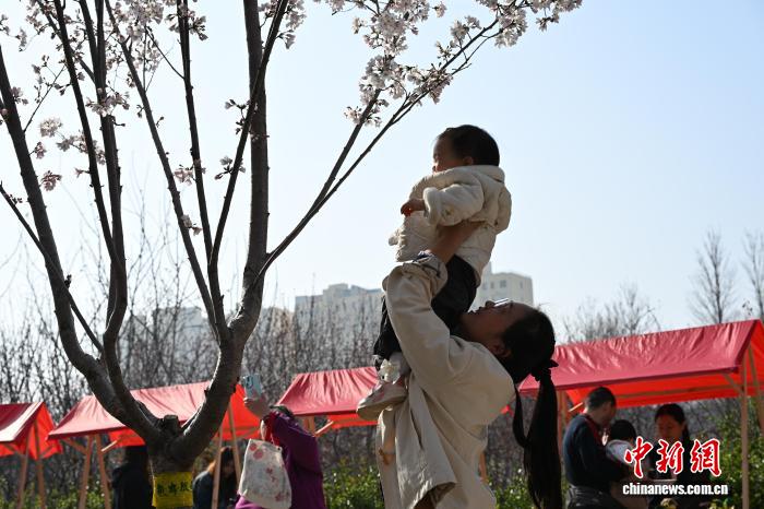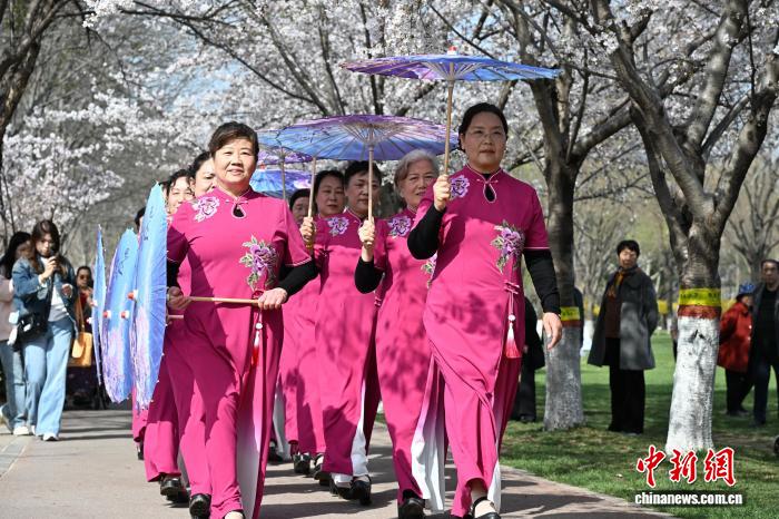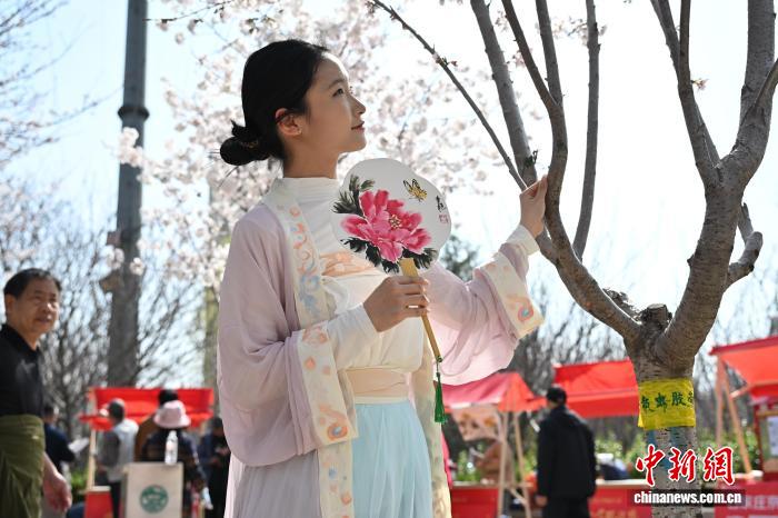 图为乘客身脱汉服正在樱花树停摄影。付杉 摄